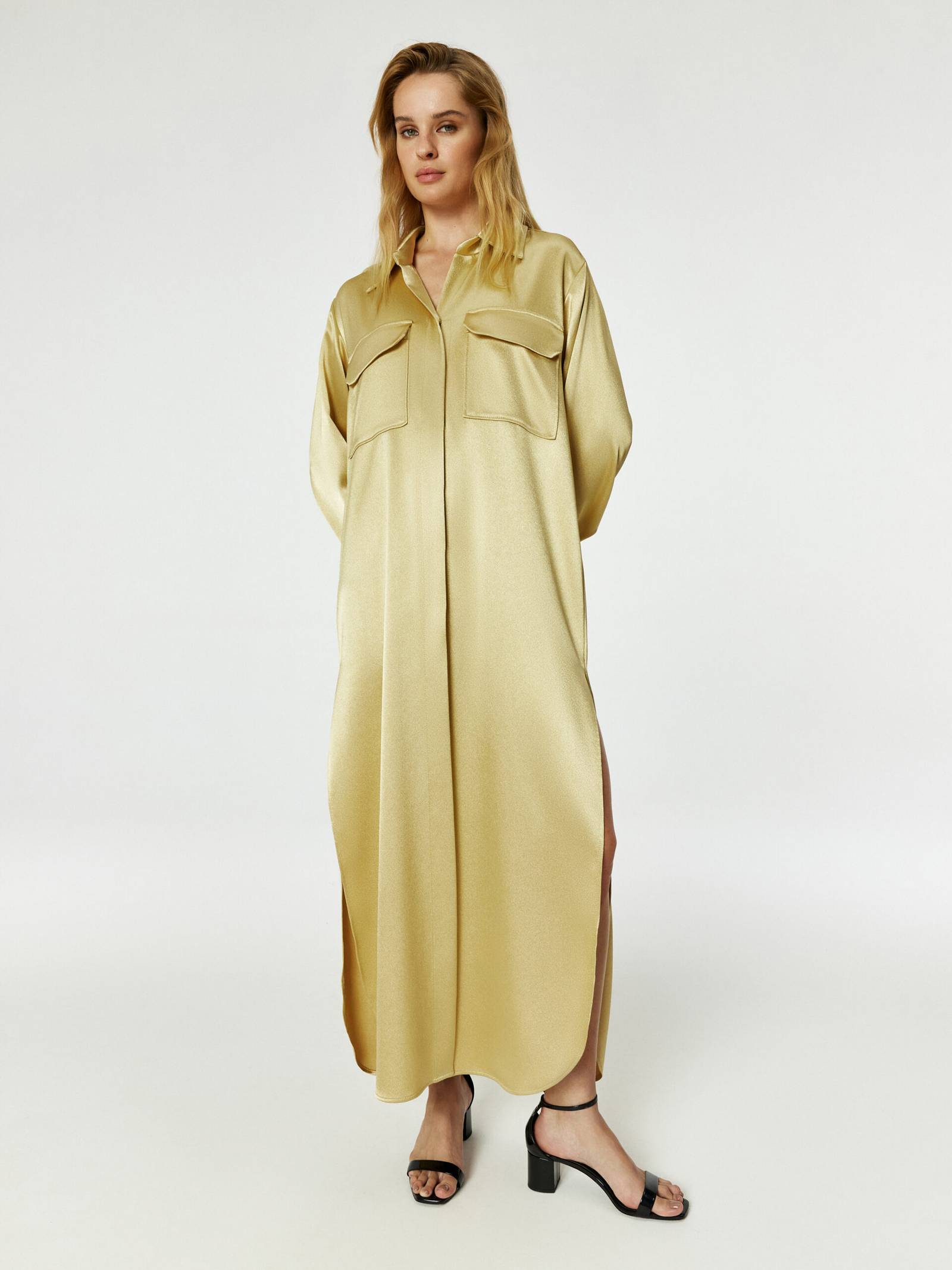 Накидка або довга сукня сорочка. Модель пряма, зі спущеним плечем, накладними кишенями на грудях, високими розрізами по бічних швах і закругленою формою по низу. У комплекті з поясом.
